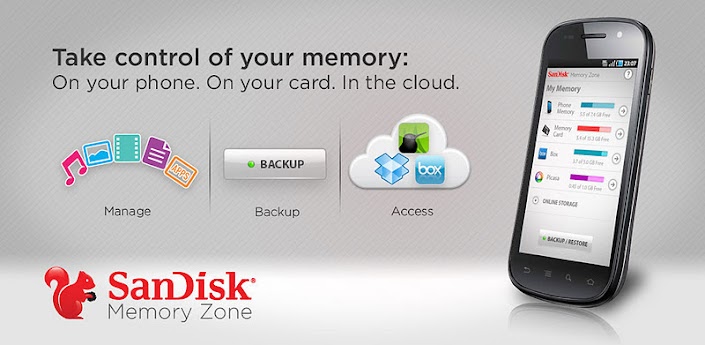 The SanDisk Memory Zone app makes it easier to manage and back up your Android™ powered device's memory. This versatile app lets you quickly copy your files to a memory card or to a variety of supported online storage services, freeing up your phone's internal memory. And thanks to its intuitive graphical interface, Memory Zone also makes it easy to organize, browse, and password protect your files.